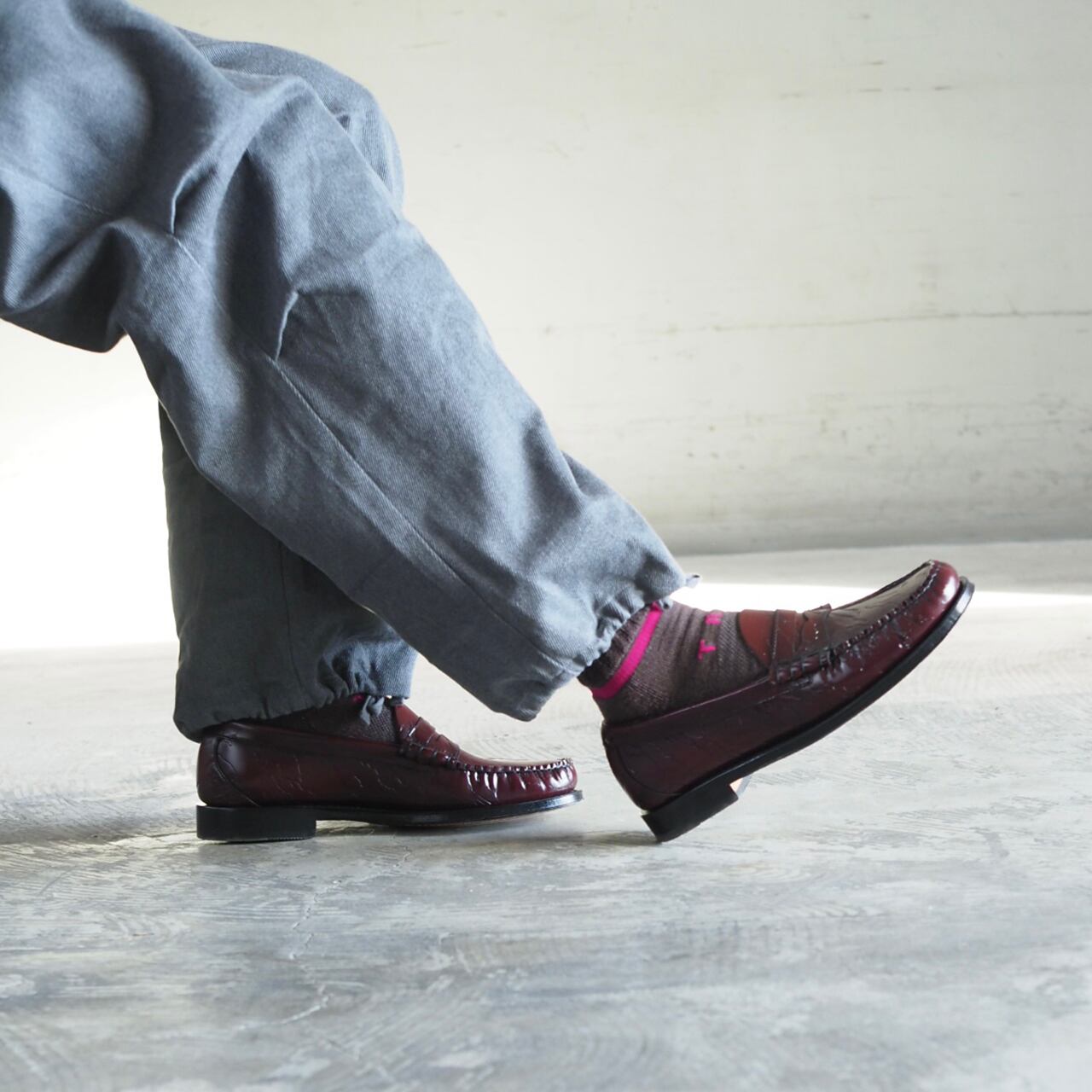 足首から上部は、緩く編まれており強い締め付け感もなく、クシュっと下げて履いても様になります。